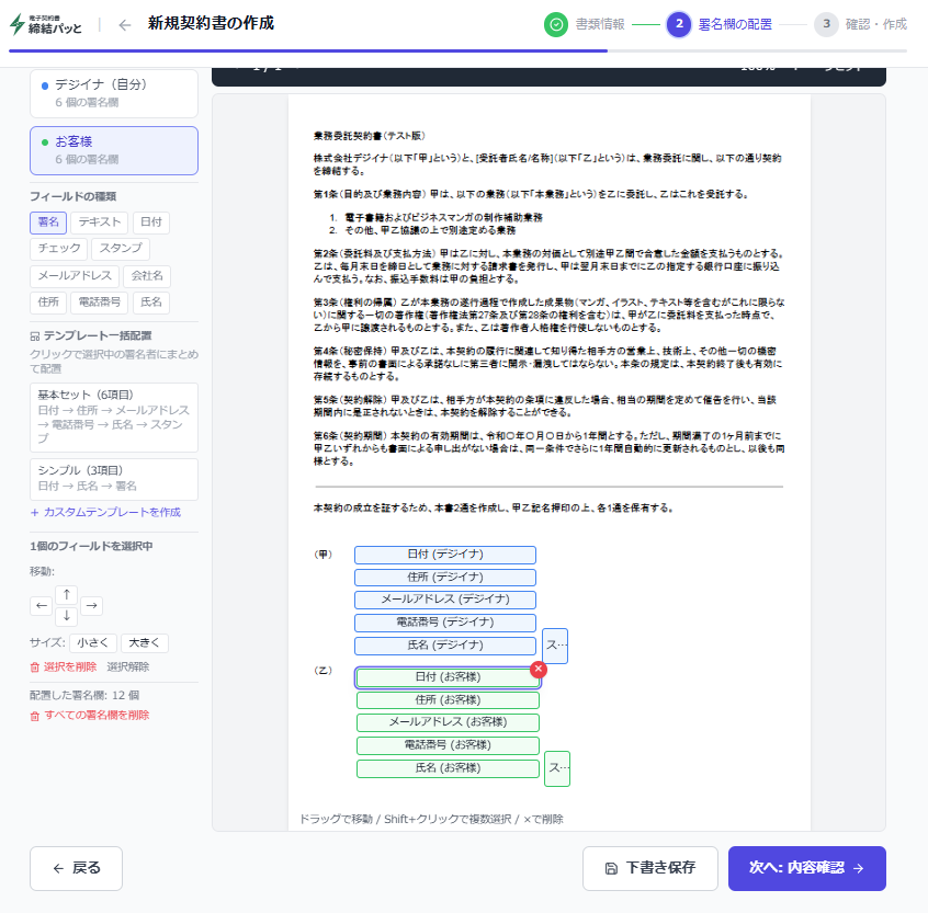 署名者ごとにフィールドが色分けされるので、誰の入力欄かひと目で分かります。 配置が終わったら「次へ: 内容確認」ボタンで進みましょう。